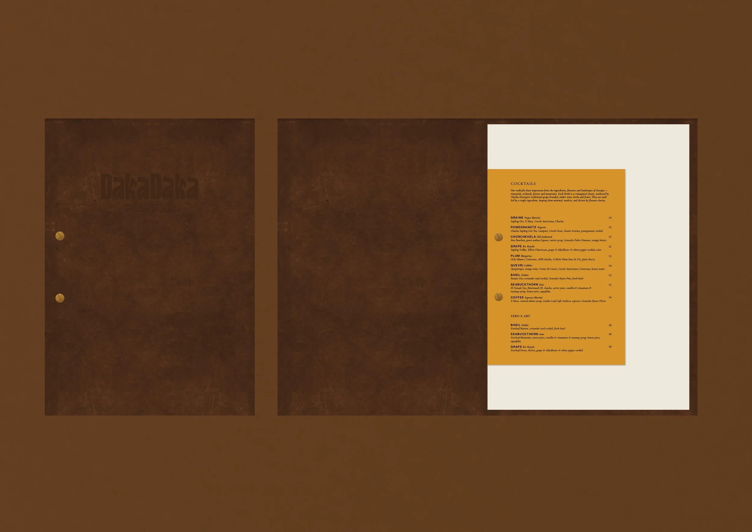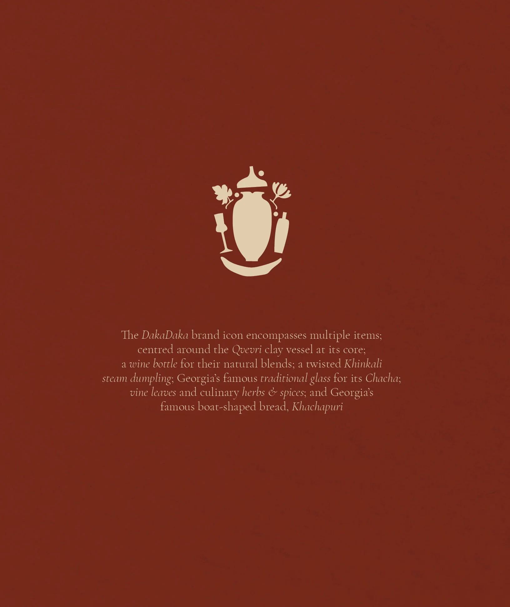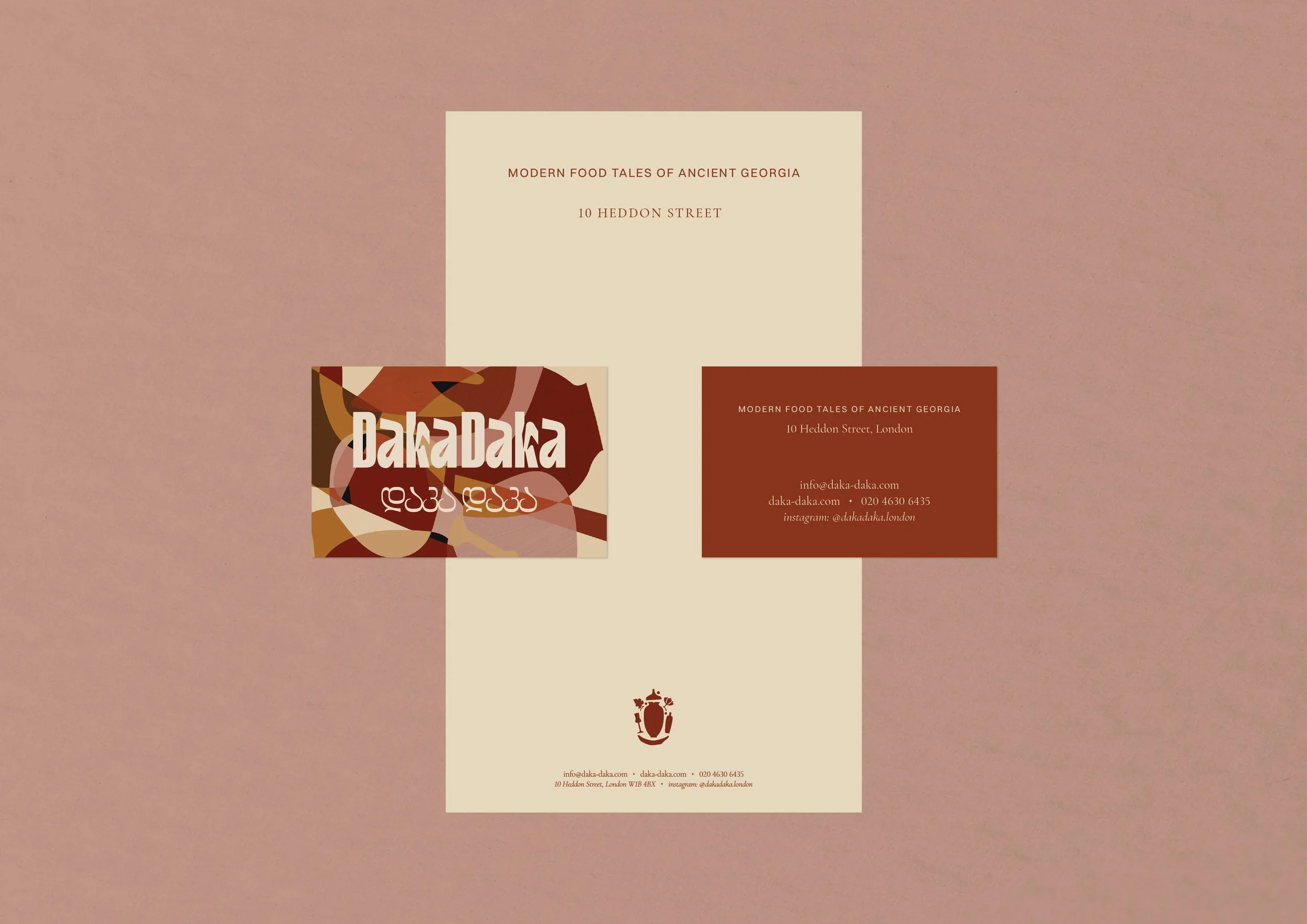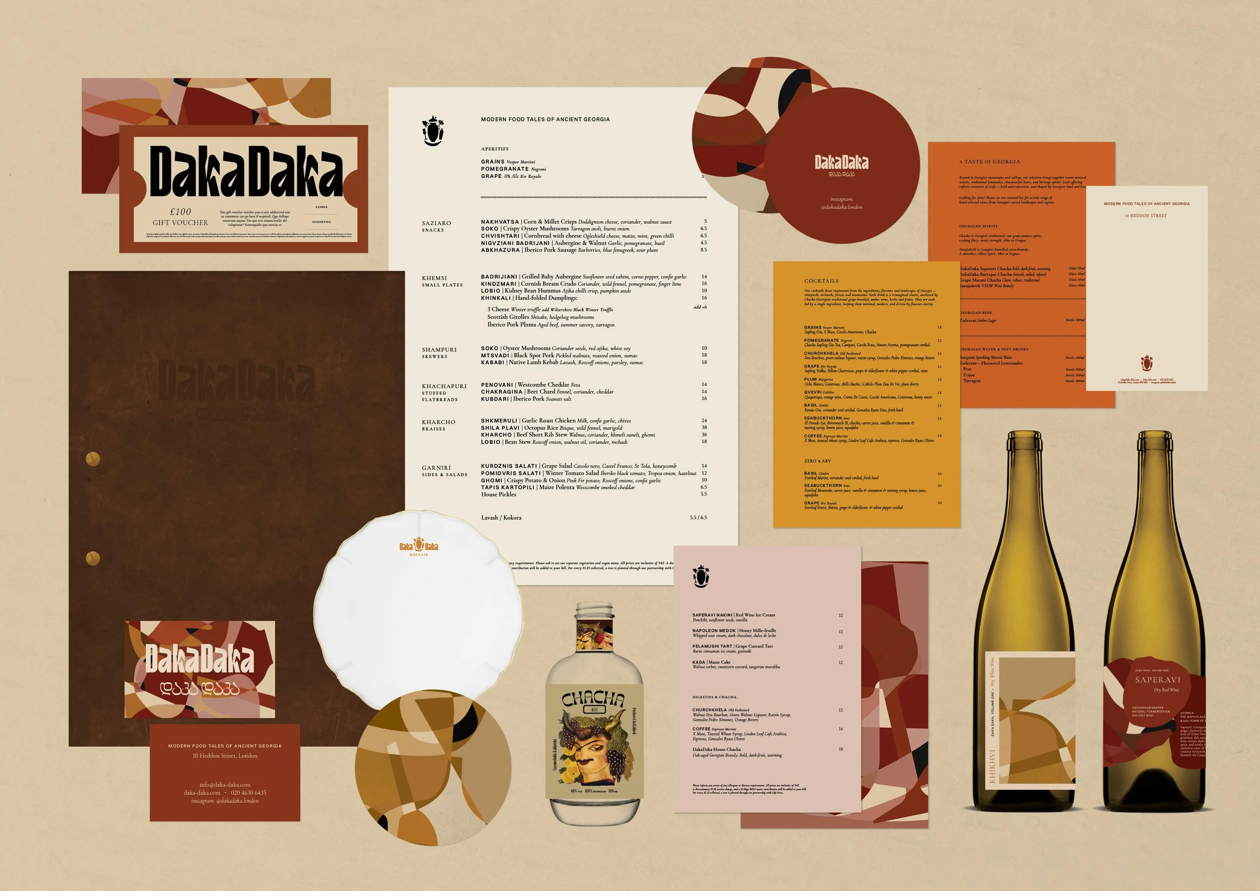 The positioning, naming and brand narrative was established first. Derived from various meanings: hectic, fiery-passion and hustle & bustle, the name ‘DakaDaka’ is a local term which personifies chaotic conversations, busy streets, and the loud sounds and intimate chatter found within local Georgian dining rooms. The tagline ‘Modern Food Tales of Ancient Georgia’ was created to bring ancient storytelling and flavours to modern locations. From here, the full brand development was created: visual identity, menu design, marketing collateral, and the directional look & feel for signage, OS&E and uniforms. Bespoke mosaic patterns were created to reflect beautiful mosaic art found around the streets and tapestries of Georgia – reflecting a ‘mosaic of flavours’ which the culinary menu offers. Menus and brand collateral follow a very neat and simple format – bringing elegance and opulence to lively sharing dishes. Further development spanned into designing wine labels and ‘Chacha’ brandy labels for their in-house blends.