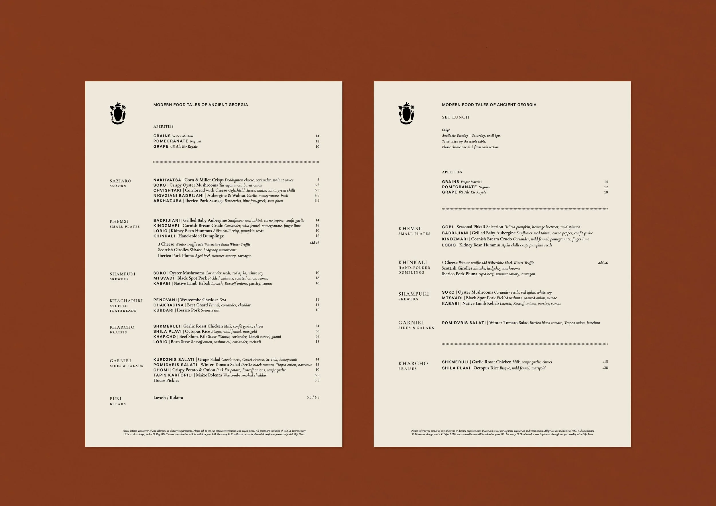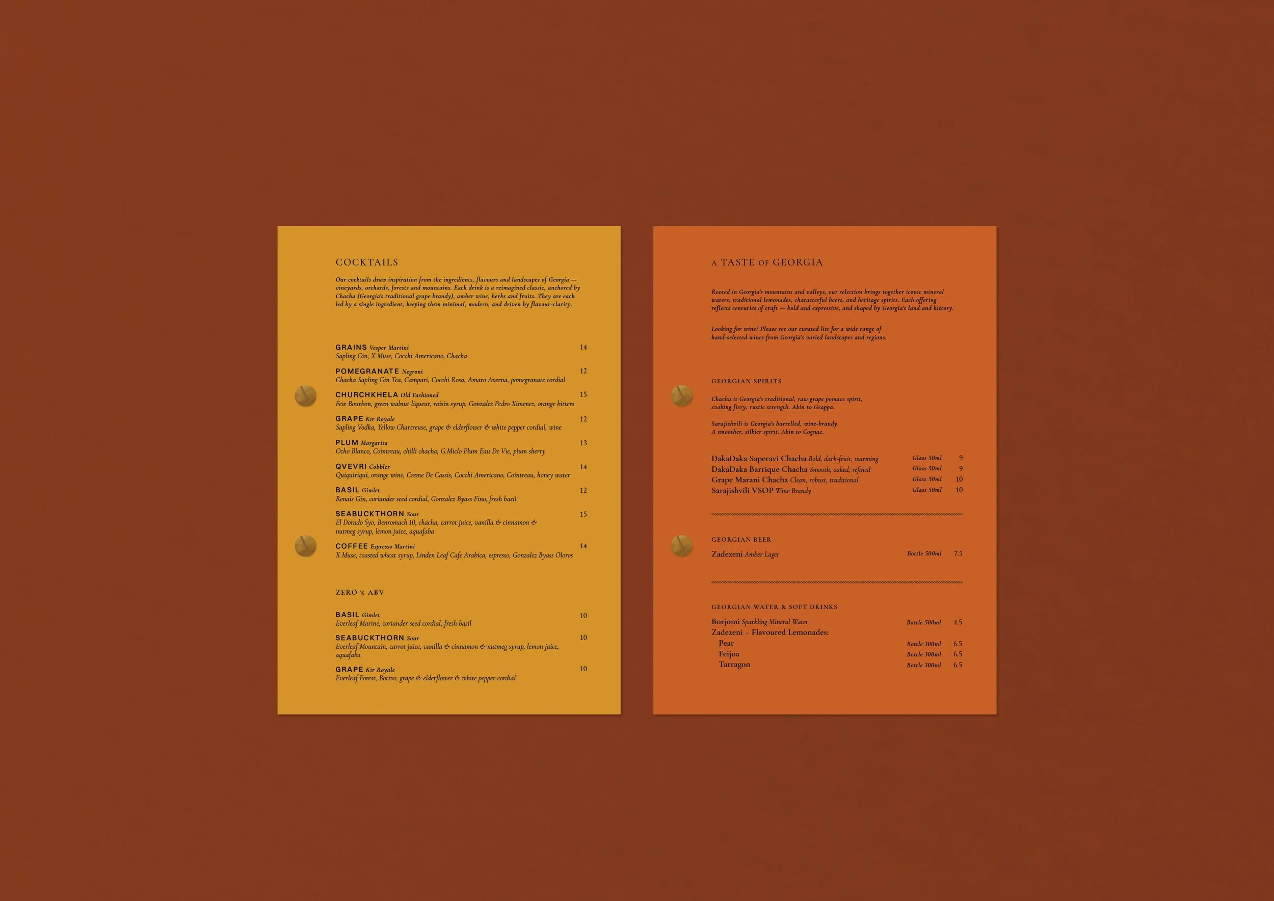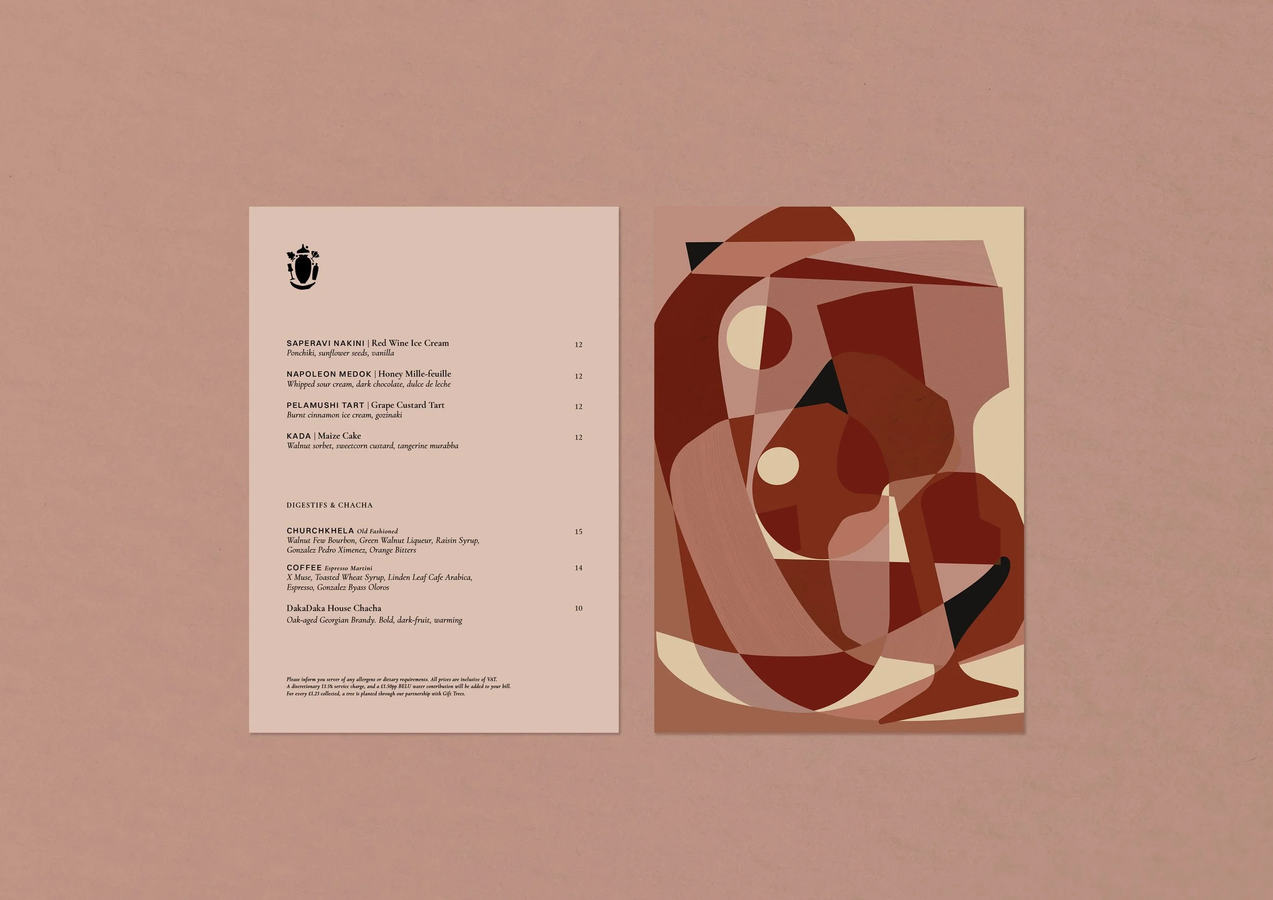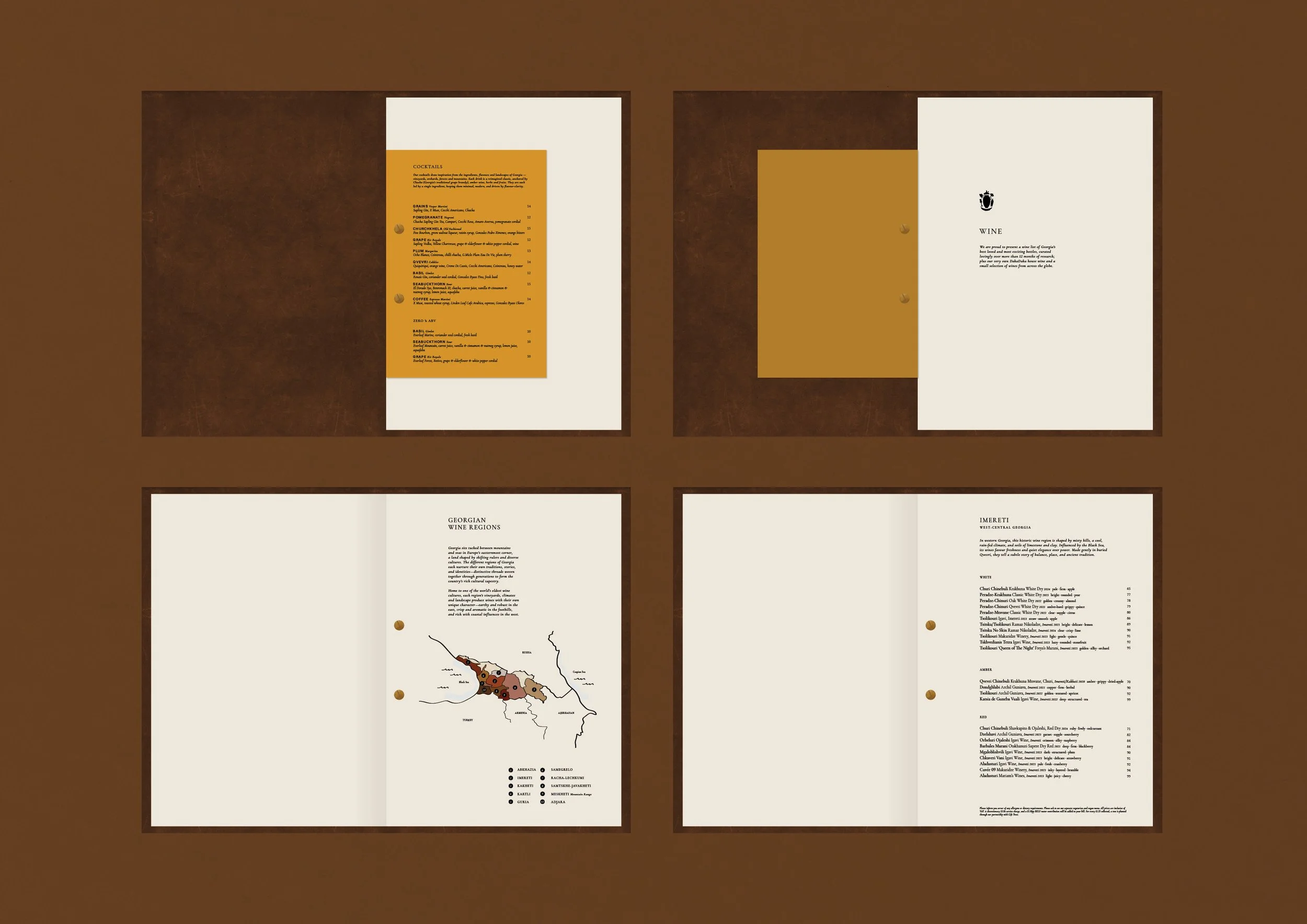 The positioning, naming and brand narrative was established first. Derived from various meanings: hectic, fiery-passion and hustle & bustle, the name ‘DakaDaka’ is a local term which personifies chaotic conversations, busy streets, and the loud sounds and intimate chatter found within local Georgian dining rooms. The tagline ‘Modern Food Tales of Ancient Georgia’ was created to bring ancient storytelling and flavours to modern locations. From here, the full brand development was created: visual identity, menu design, marketing collateral, and the directional look & feel for signage, OS&E and uniforms. Bespoke mosaic patterns were created to reflect beautiful mosaic art found around the streets and tapestries of Georgia – reflecting a ‘mosaic of flavours’ which the culinary menu offers. Menus and brand collateral follow a very neat and simple format – bringing elegance and opulence to lively sharing dishes. Further development spanned into designing wine labels and ‘Chacha’ brandy labels for their in-house blends.